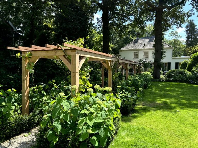 De klant had wel een verzoek om de bestaande klimop /beplanting te behouden. Daardoor moesten wij de oude pergola voorzichtig demonteren en de beplanting zoveel mogelijk takt te houden.