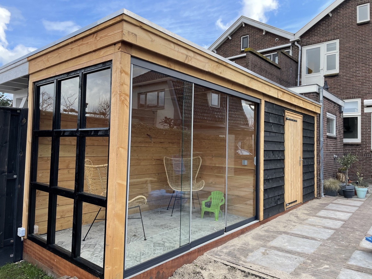 De beide overkappingen hebben een afmeting 6 meter lang en 3 meter breed zijn gemaakt van douglas hout en de ene voorzien van glazen deuren en de andere kant voorzien van glazen ruitjes .