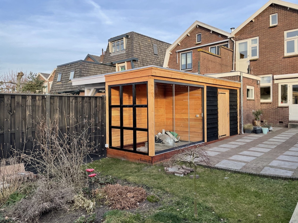 De beide overkappingen hebben een afmeting 6 meter lang en 3 meter breed zijn gemaakt van douglas hout en de ene voorzien van glazen deuren en de andere kant voorzien van glazen ruitjes .