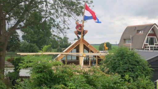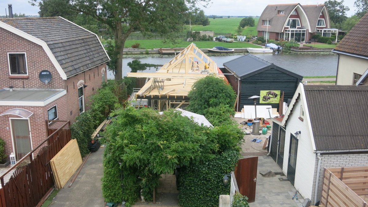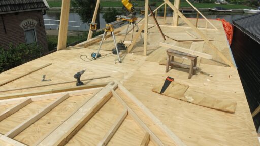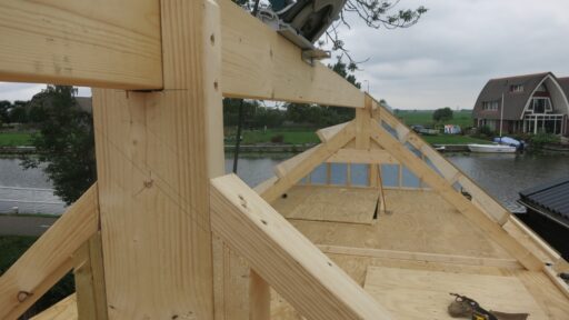 Plaatsen van houten dak constructie
