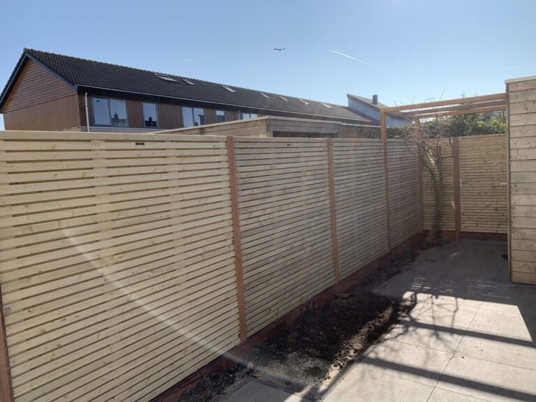 Elan schutting Afgelopen week een Elan schutting geplaatst in Alphen aan de Rijn deze schermen zijn gemaakt van smalle horizontale geïmpregneerde latjes van het merk Hillhout en hangen tussen hardhouten palen.daarnaast is de schutting voorzien van een hardhouten borderplank. Elan…