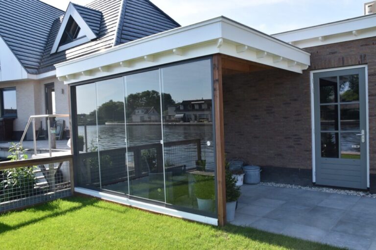 Overkapping Afgelopen week een overkapping geplaatst in Amstelveen . De robuuste douglas houten staanders rusten op betonnen poeren, de wanden zijn aan beide kanten bekleed met Zweedse rabat delen waarvan de binnen zijde grijs gespoten zijn. aan de voorkant hebben…