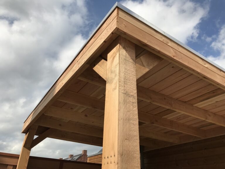 Overkapping Afgelopen week een douglas houten overkapping geplaatst in Rotterdam. Deze is gemaakt van douglas houten palen balken en planken. De staanders van de overkapping rusten op hardhouten palen van 1,5 die de grond ingaan om vervolgens een draadeind er…