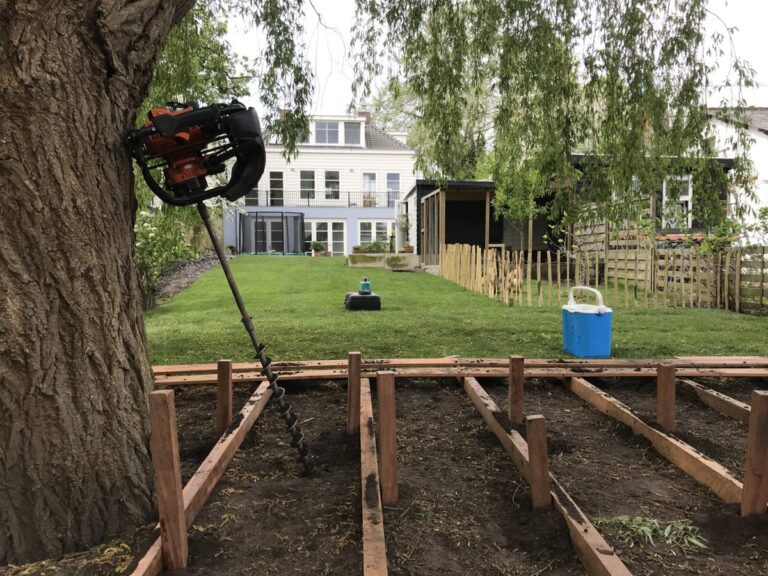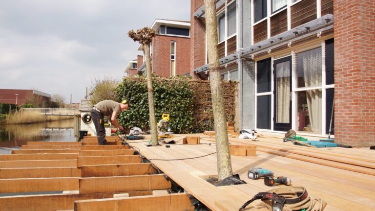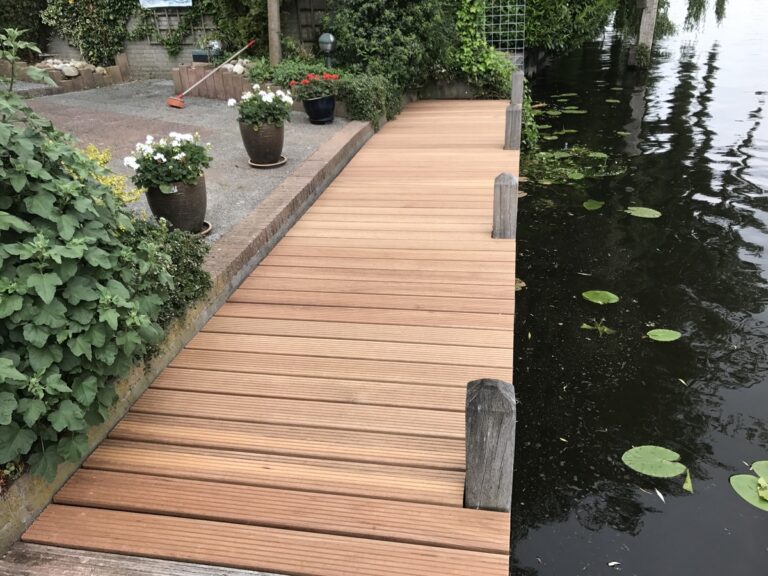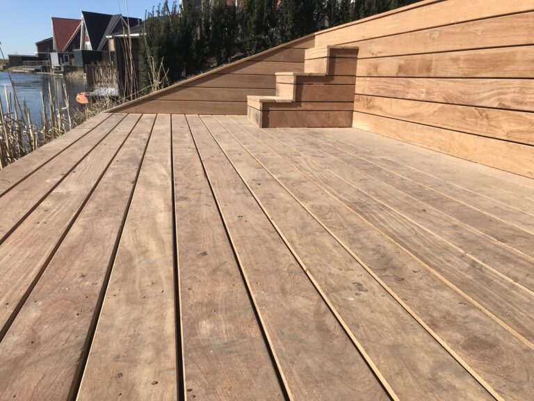 Plaatsen van bankirai vlonder in Amsterdam Op een zeer mooie locatie aan de Buiksluiterdijk in Amsterdam een bankirai vlonder geplaatst met een uitsparing voor de boom. de vlonder een afmeting van 7 meter breed en 5 meter diep. De vlonder…