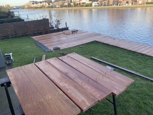 Afgelopen week een hardhouten vlonder van cumaru delen geplaatst in Alphen aan de Rijn .De vlonder rust groten deels op de betonnen kade en is vast geschroefd op hardhouten liggers met Spax R.V.S Vlonderschroeven.