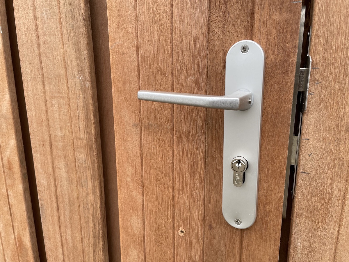 De dubbelen poortdeur elk 120 cm en de derde deur zijn voorzien van rvs slot.