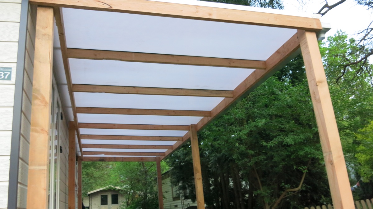 Wij maken overkappingen van allerlei soorten hout in de kleur van uw keuze. Samen met u kijken we eerst naar uw situatie en maken vervolgens een tekening en een begroting.