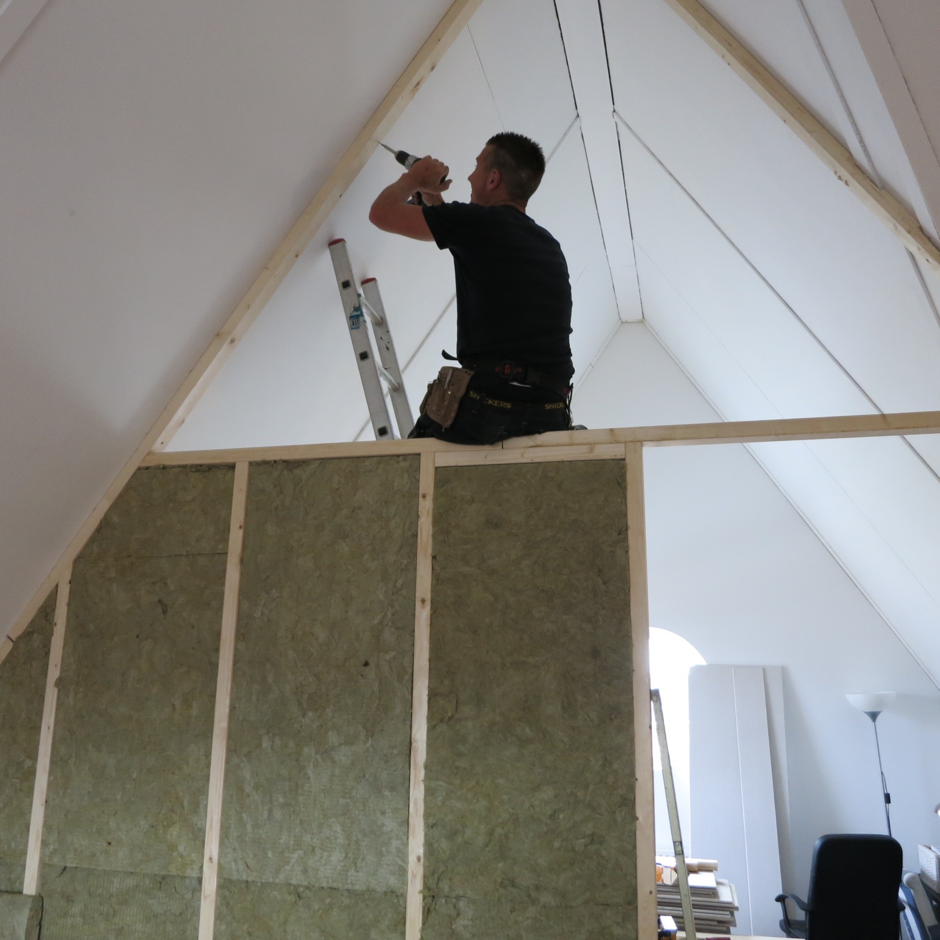 In de tussenruimte van plaat naar muur werken we de water- en elektriciteitsleidingen weg, zodat er een strak geheel ontstaat. We gebruiken isolatiewol om te wanden termisch en akoestisch goed te isoleren.
