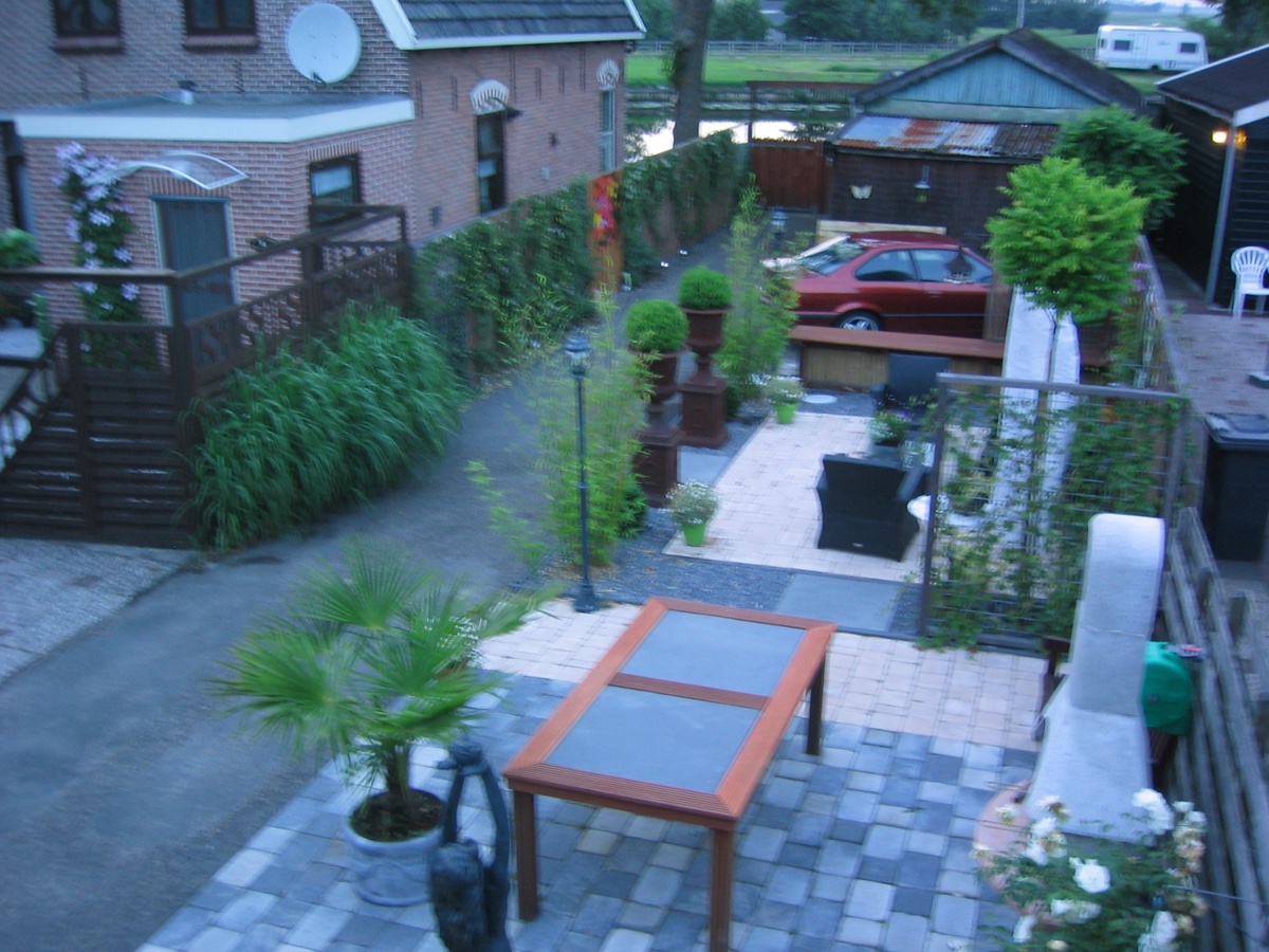 De tafel bestaat uit robuuste bankirai palen van 90×90 mm en een hardhouten regelwerk met daar op bankiray vlonder delen.