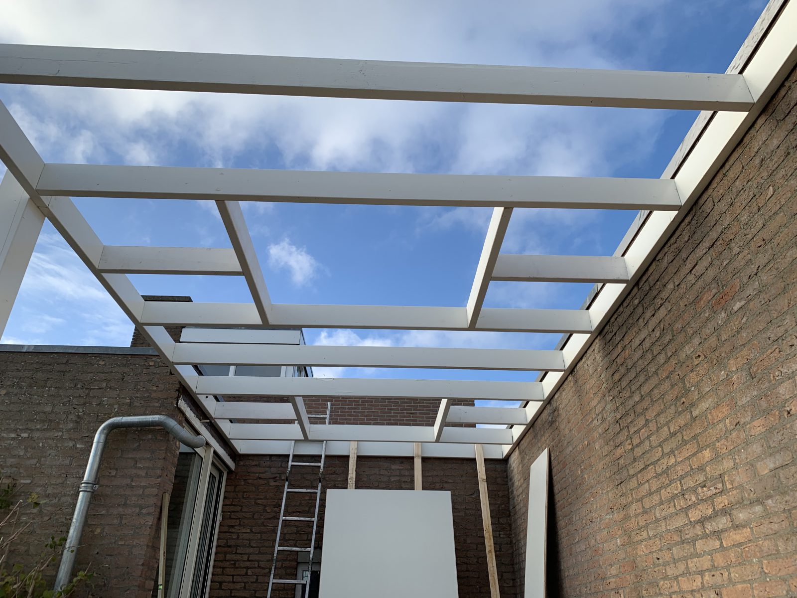 Verder bestaat de overkapping uit voor gelakte vurenhouten balken en underlayment als dak beschot.