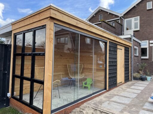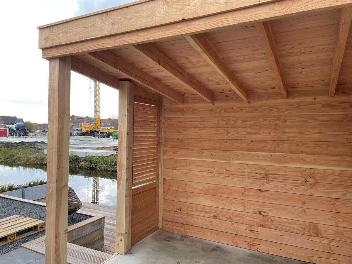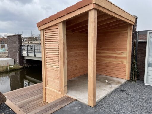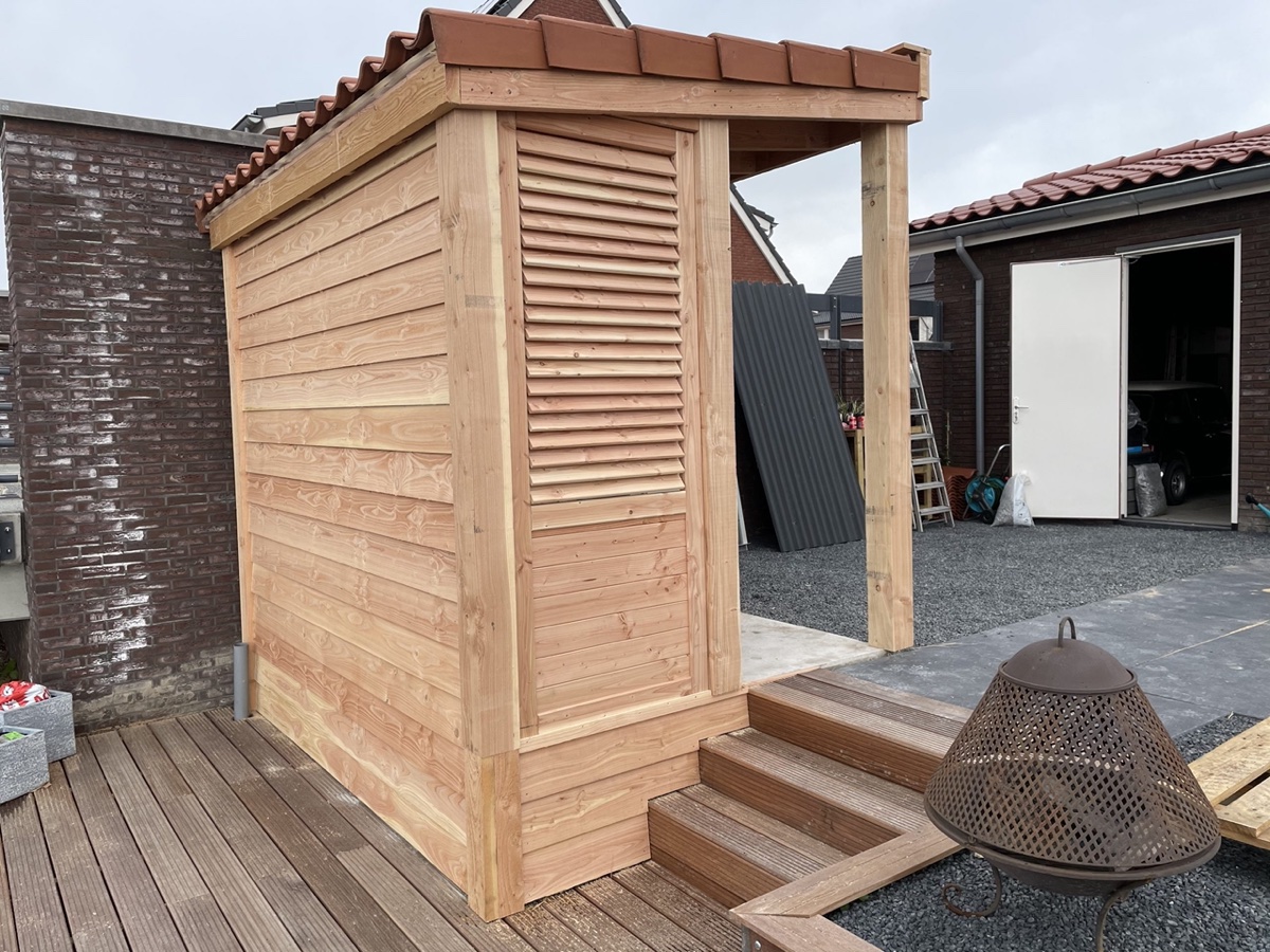 Afgelopen week een standaard Nieuwbouw schuurtje omgebouwd tot overkapping van douglas hout met in de zijwand een shutter paneel en op het dak liggen pannen.