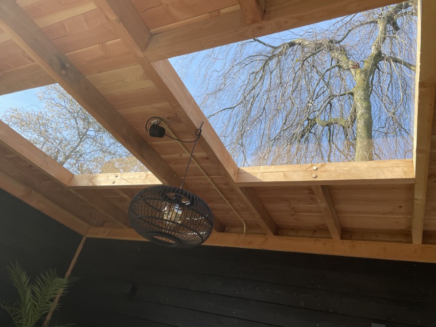 Het dak bestaat uit douglas houten balken met daarop velling delen en EPDM daarnaast hebben we het dak voorzien van twee dakramen van gehard glas.