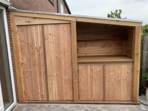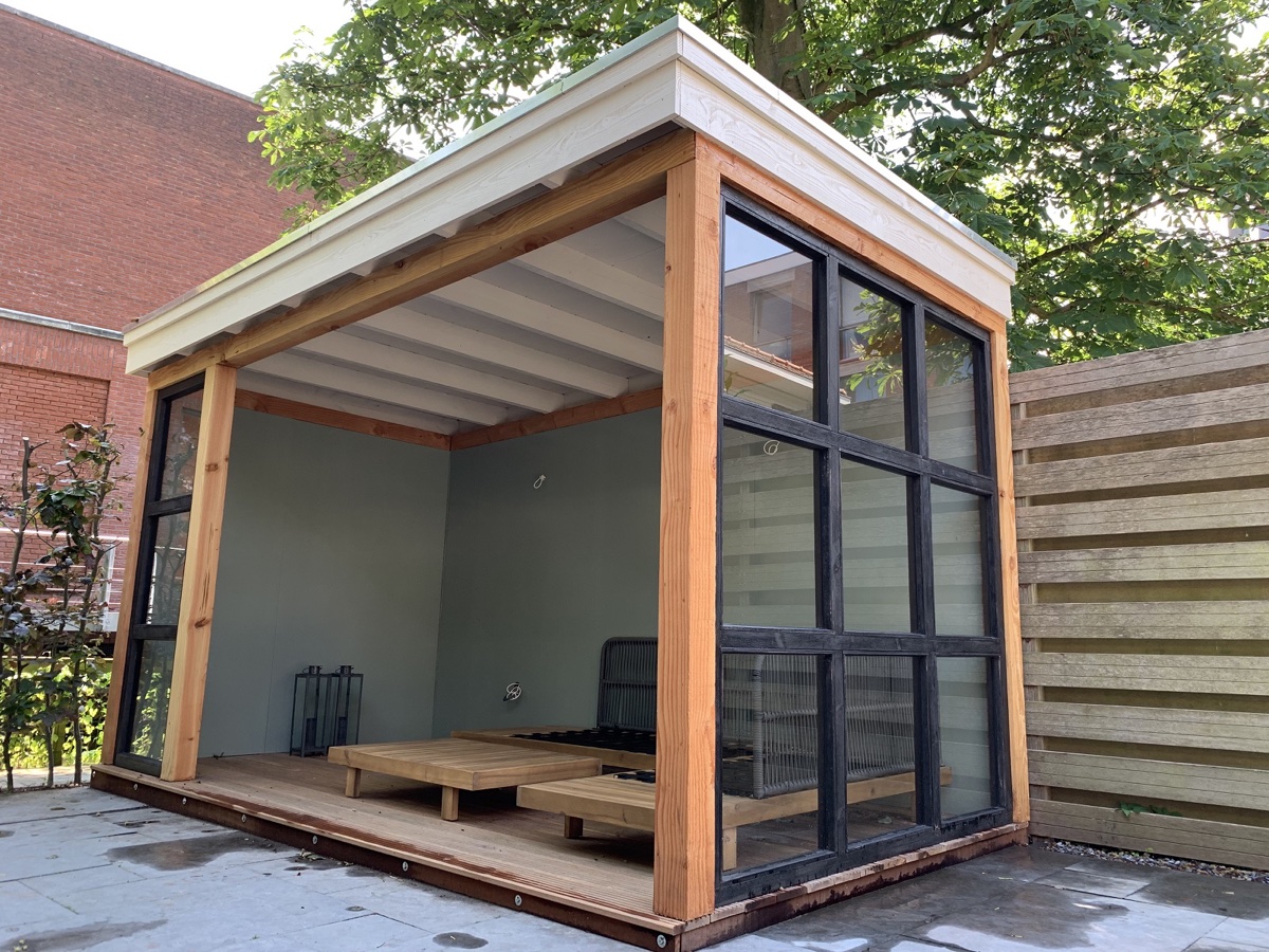 Afgelopen week een overkapping en een buitenverblijf gemaakt in Alphen aan de Rijn het buiten verblijf is gemaakt van hoofdzakelijk douglas hout en de binnenwanden zijn bekleed met watervast multiplex.