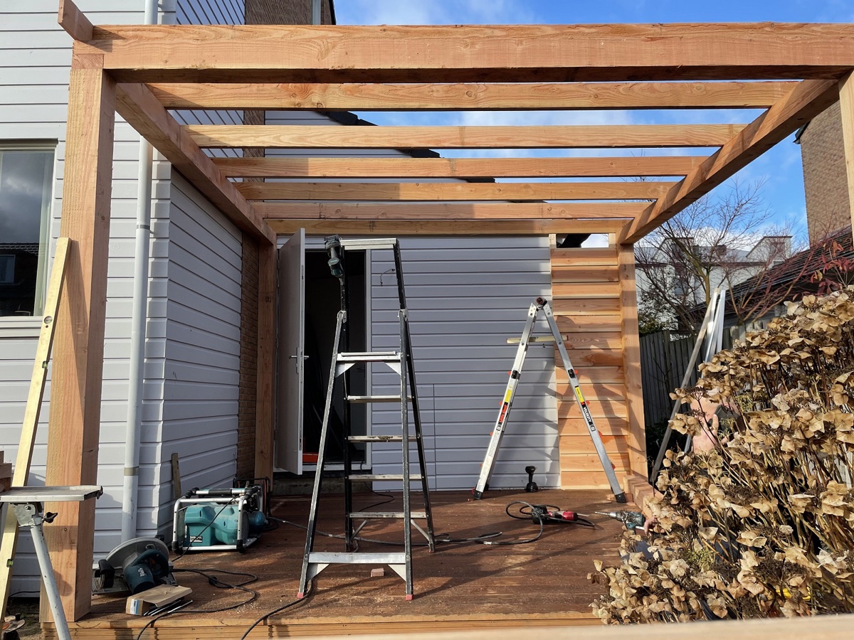 de overkapping is gemaakt Douglas hout ondanks dat de overkapping tegen het huis is gemaakt staat deze er toch los van , aangezien de overkapping met vlonder niet onderuit is en het huis wel , naast de twee glazen schuifwanden is in de ene zijkant ook nog een extra raam geplaatst voor nog meer licht inval. Op het dak ligt EPDM.