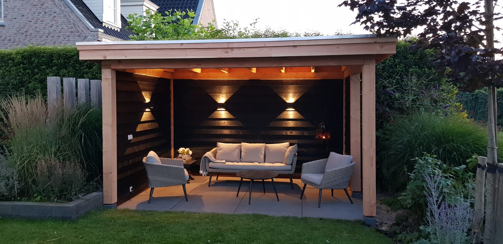 Afgelopen week een overkapping geplaatst in Montfoort ,deze rust op een hardhouten fundering met daarop robuuste Douglas houten palen. de wanden zij geïsoleerd voor wat extra geluid isolatie en zijn daarna bekleed met zwarte rabat delen.