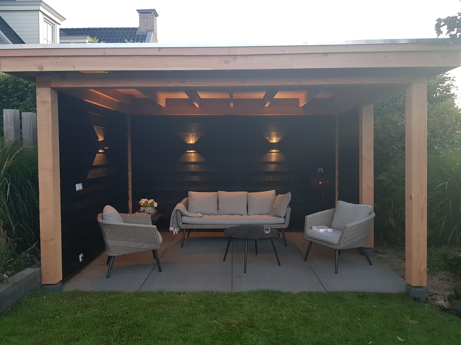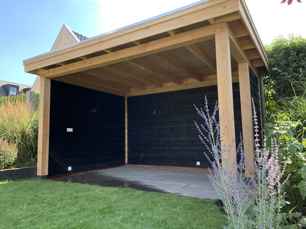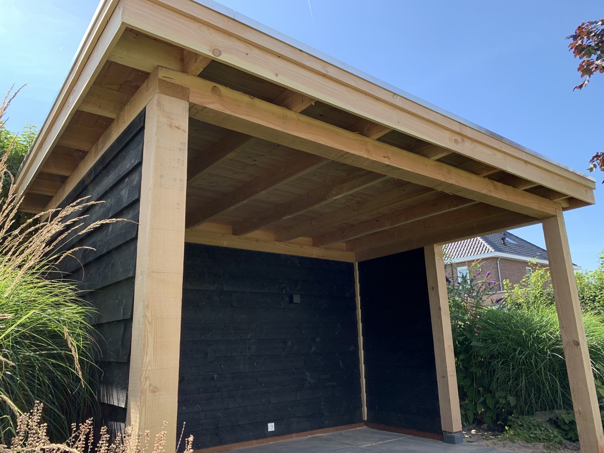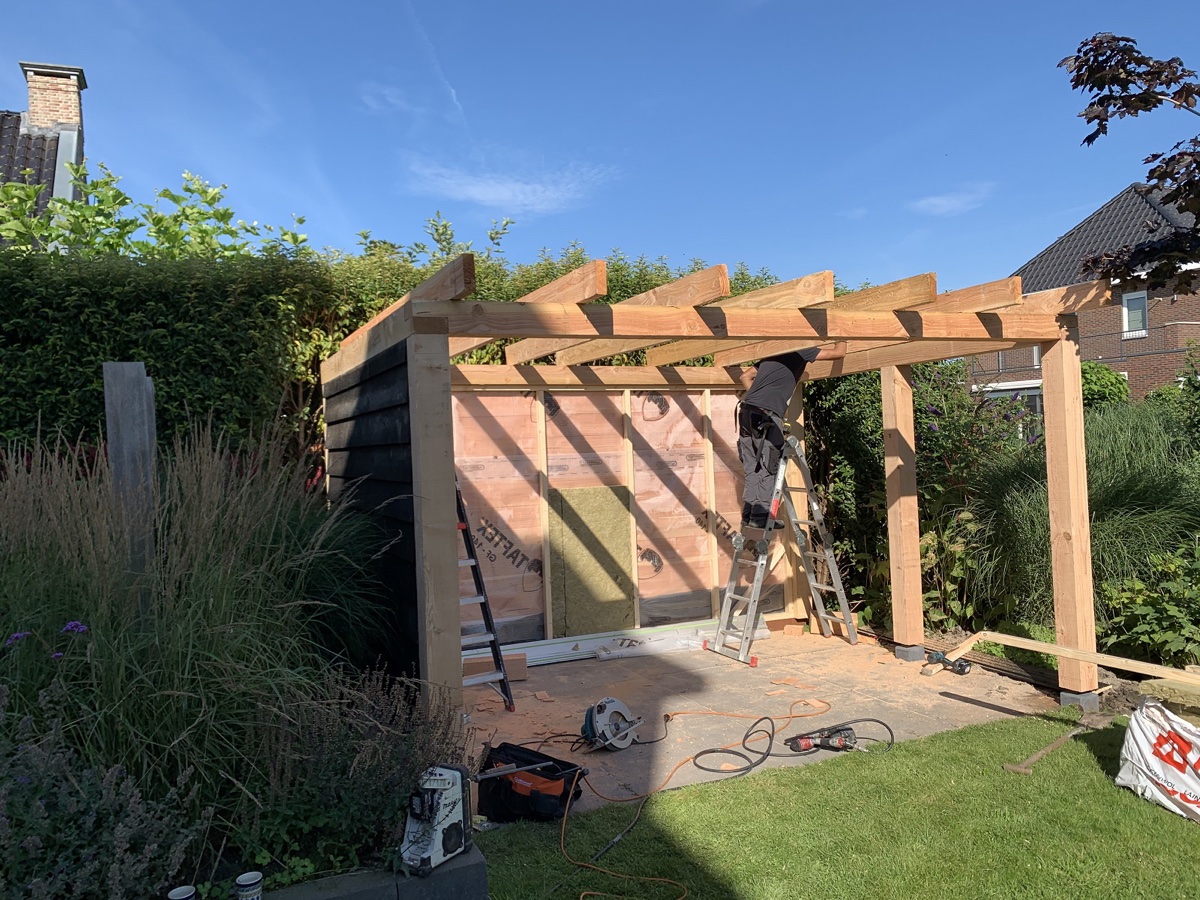 Afgelopen week een overkapping geplaatst in Montfoort ,deze rust op een hardhouten fundering met daarop robuuste Douglas houten palen. de wanden zij geïsoleerd voor wat extra geluid isolatie en zijn daarna bekleed met zwarte rabat delen.