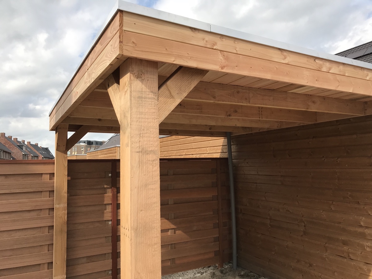 De overkapping is gemaakt van robuuste douglas palen, balken en planken. De staanders van de overkapping rust op een betonnen poer met daaronder een hardhouten paal ,dit vormt de fundering van de overkapping.