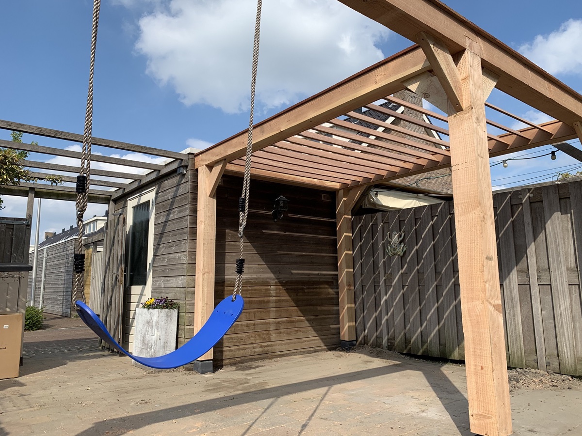 En om wat schaduw te creëren is een gedeelte van de pergola voorzien van hardhouten lamellen.