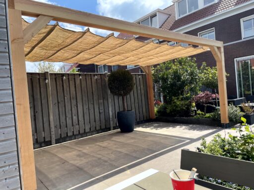 Afgelopen week een pergola met een harmonica schaduw doek geplaatst in Zevenhuizen , deze is gemaakt van Douglas houten palen 150 x 150 mm, de staanders van de pergola staan op verstelbare betonnen poeren. tussen de horizontale palen hebben wij een een harmonica schaduw doek gehangen deze is van het merk nesling.