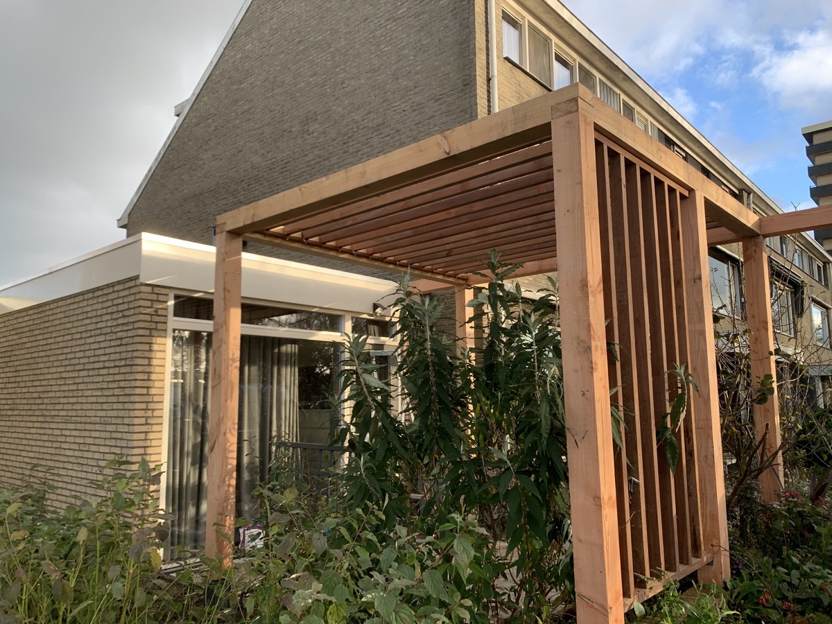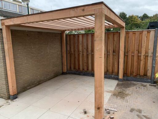 Afgelopen week een pergola geplaatst in Rijswijk deze is gemaakt van douglash houten palen en hardhouten liggers. Een gedeelte van de staanders staan op betonnen poeren.