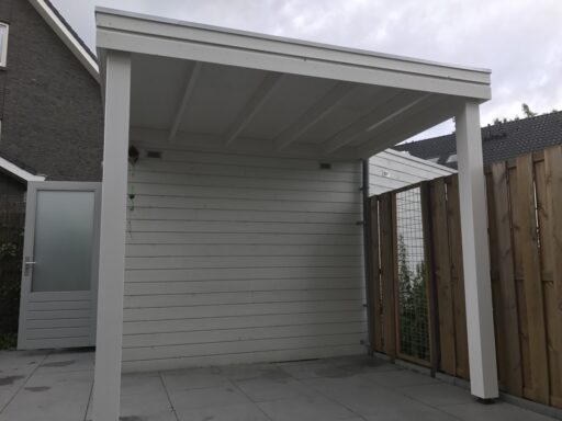 Om het hoogte verschil van voor en de achterkant van de tuin ( +/- 15 cm) op te vangen, is er een hardhouten borderplank aan de zijkant van de palen gemonteerd.