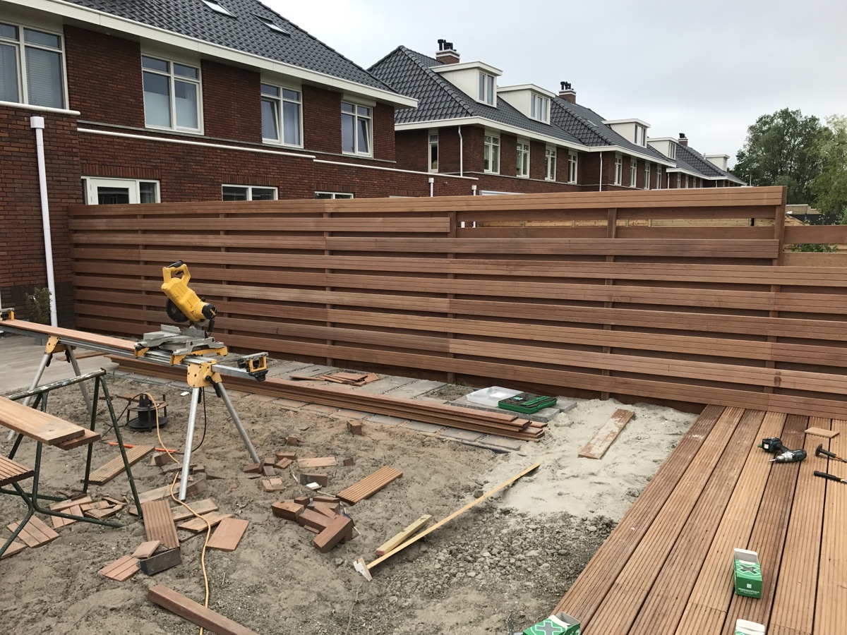 De schutting bestond uit geschaafde hardhouten palen 65 x65 x3050 mm en met daarop hardhouten schutting delen RVS bevestigd.