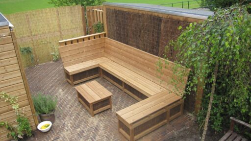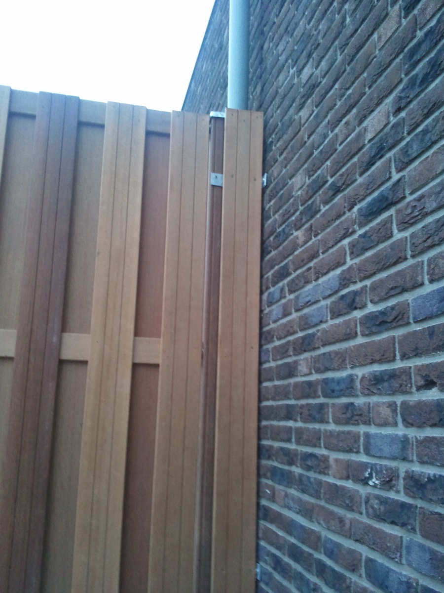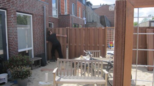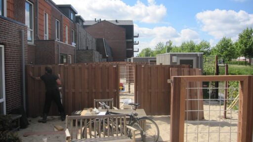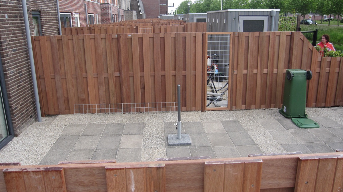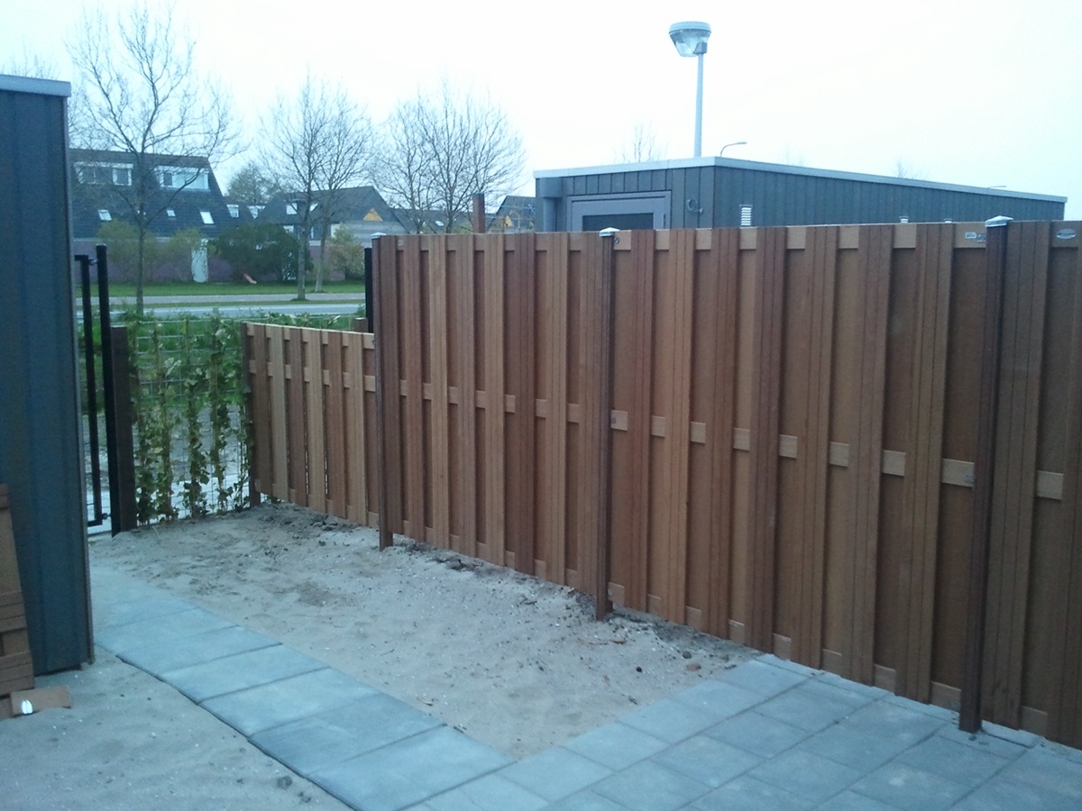 Een hardhouten schutting met een hardhouten gaaspaneel ertussen, geplaatst bij de bewoners van de nieuwe wijk Weideveld in Bodegraven.