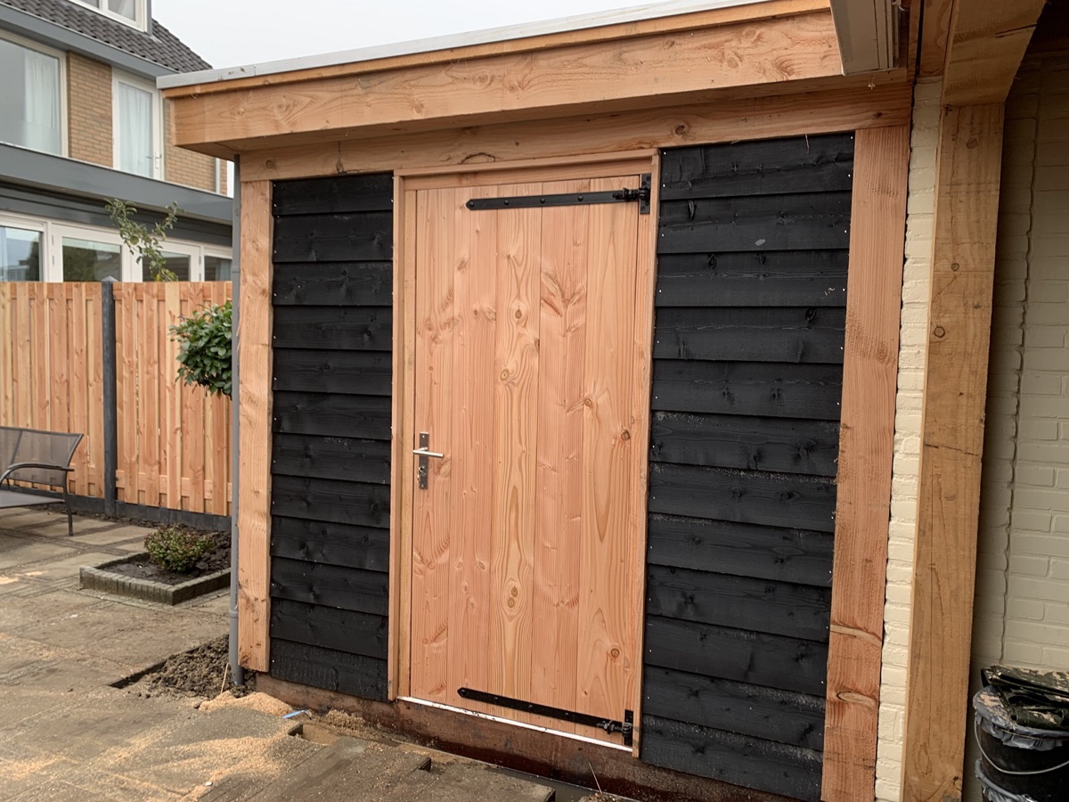 Afgelopen week hebben wij In Vleuten een schuur met een daarbij passende overkapping gemaakt. Beide zijn gemaakt van douglas hout de gevel van de schuur is bekleed met zwarte Zweedse rabat delen en op de hoeken staan onbehandelde Douglas palen.