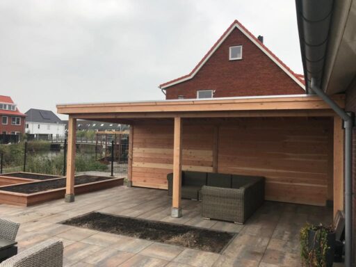 Naast de vlonder hebben wij ook de overkapping geplaatst ,deze rust op schroefpaal fundering met daarop een gestorte poer van beton.