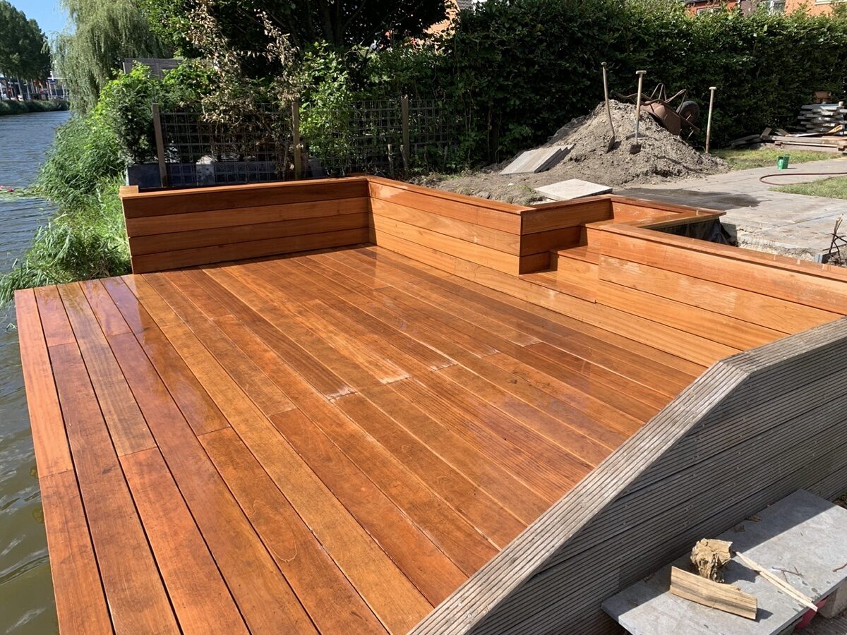 Afgelopen week een vlonder met damwand en uitwendige trap geplaatst in Ypenburg Den Haag deze is gemaakt van brede bankiray vlonder delen na 28x 190mm . de vlonder rust op een regelwerk van hardhouten balken die vervolgens gemonteerd is aan hardhouten palen.
